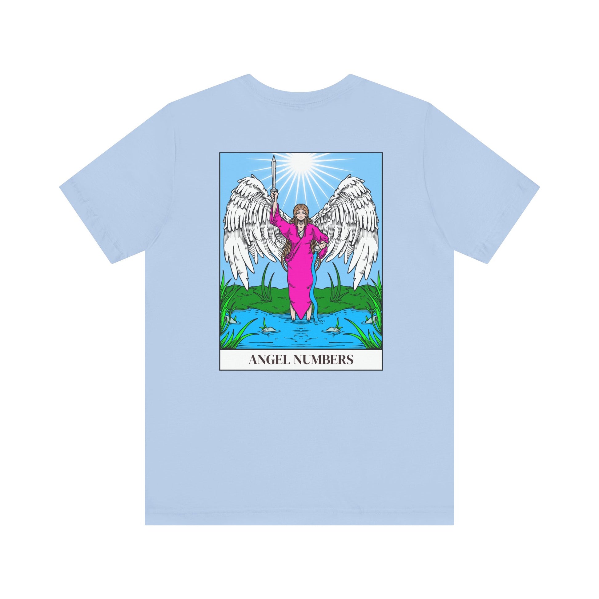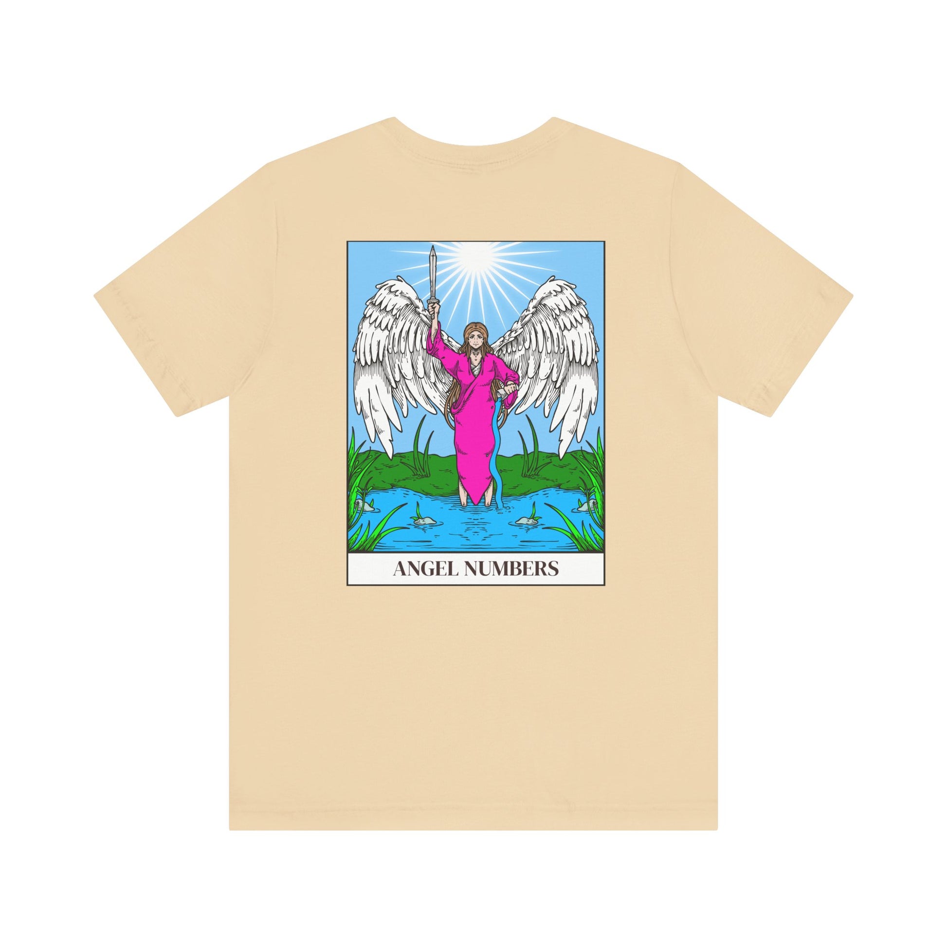 Each shirt in the collection showcases a prominent angel number with advice on the front. On the back, a beautiful angel is surrounded by intricate tarot-inspired artwork, merging the spiritual significance of angel numbers with the rich symbolism of tarot imagery and meaning.