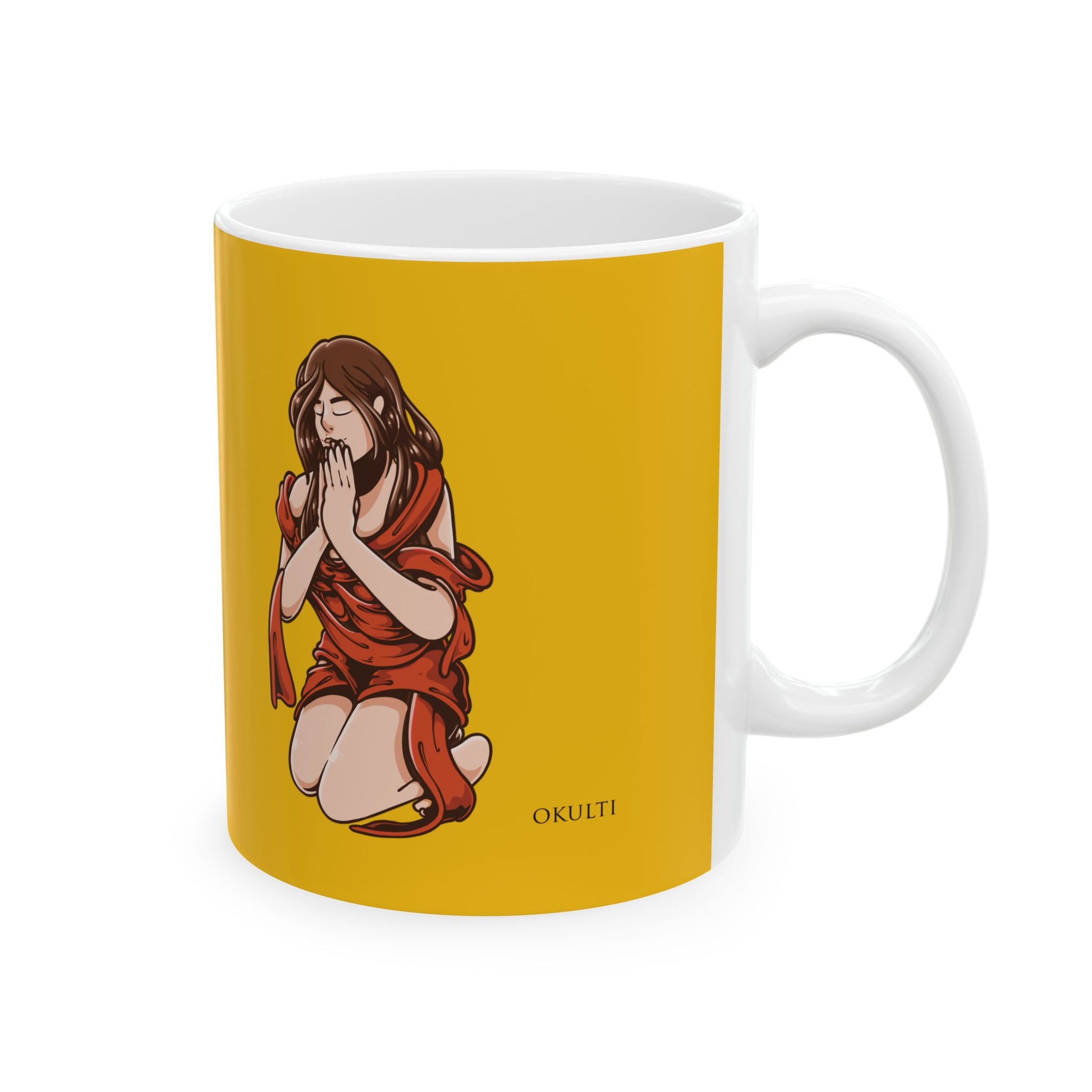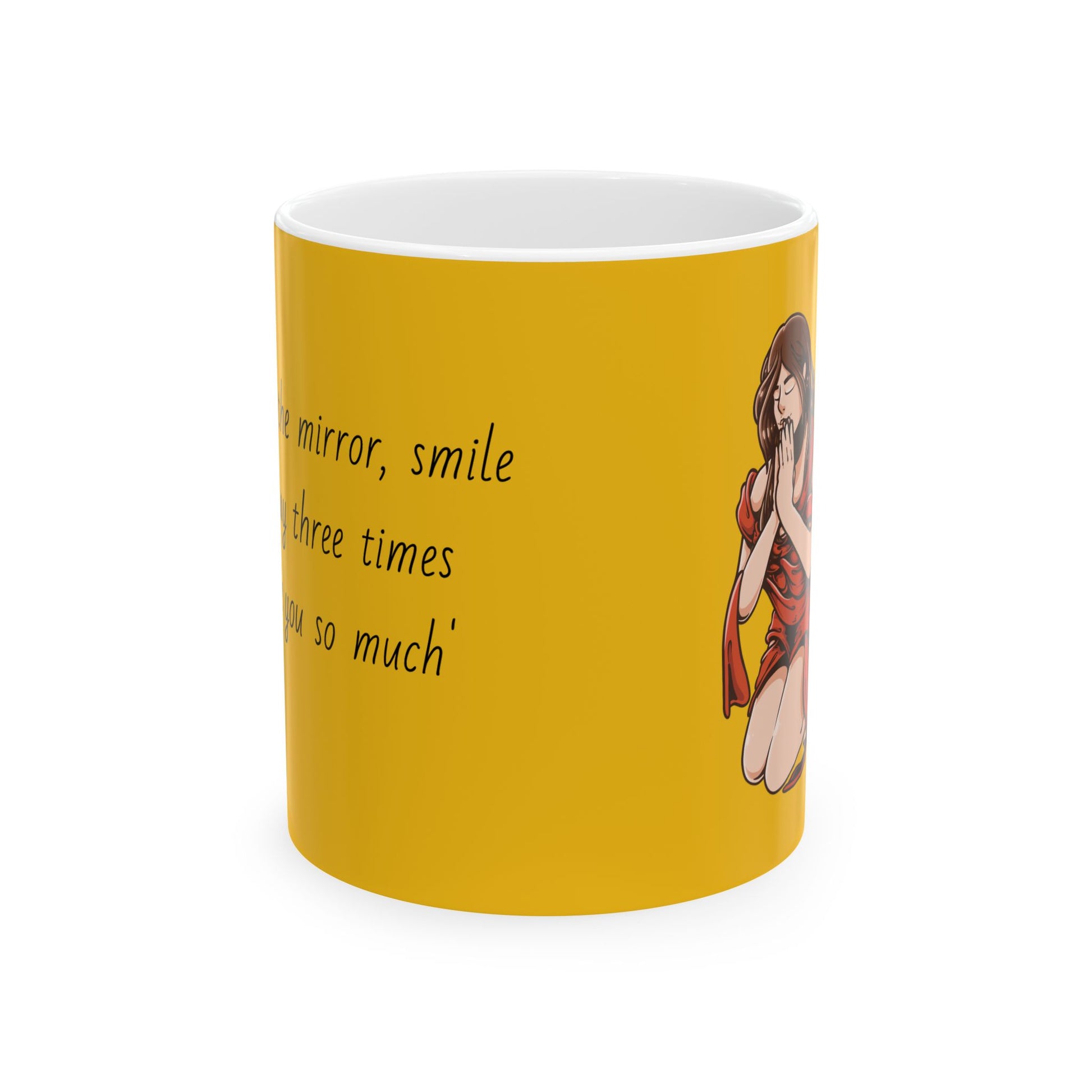Thoughtfully Designed: Featuring a comfortable C-handle and a glossy finish, these mugs are as easy to hold as they are delightful to admire. Each one showcases an inspiring image of a woman kneeling in self-reflection, honoring herself and her thoughts.