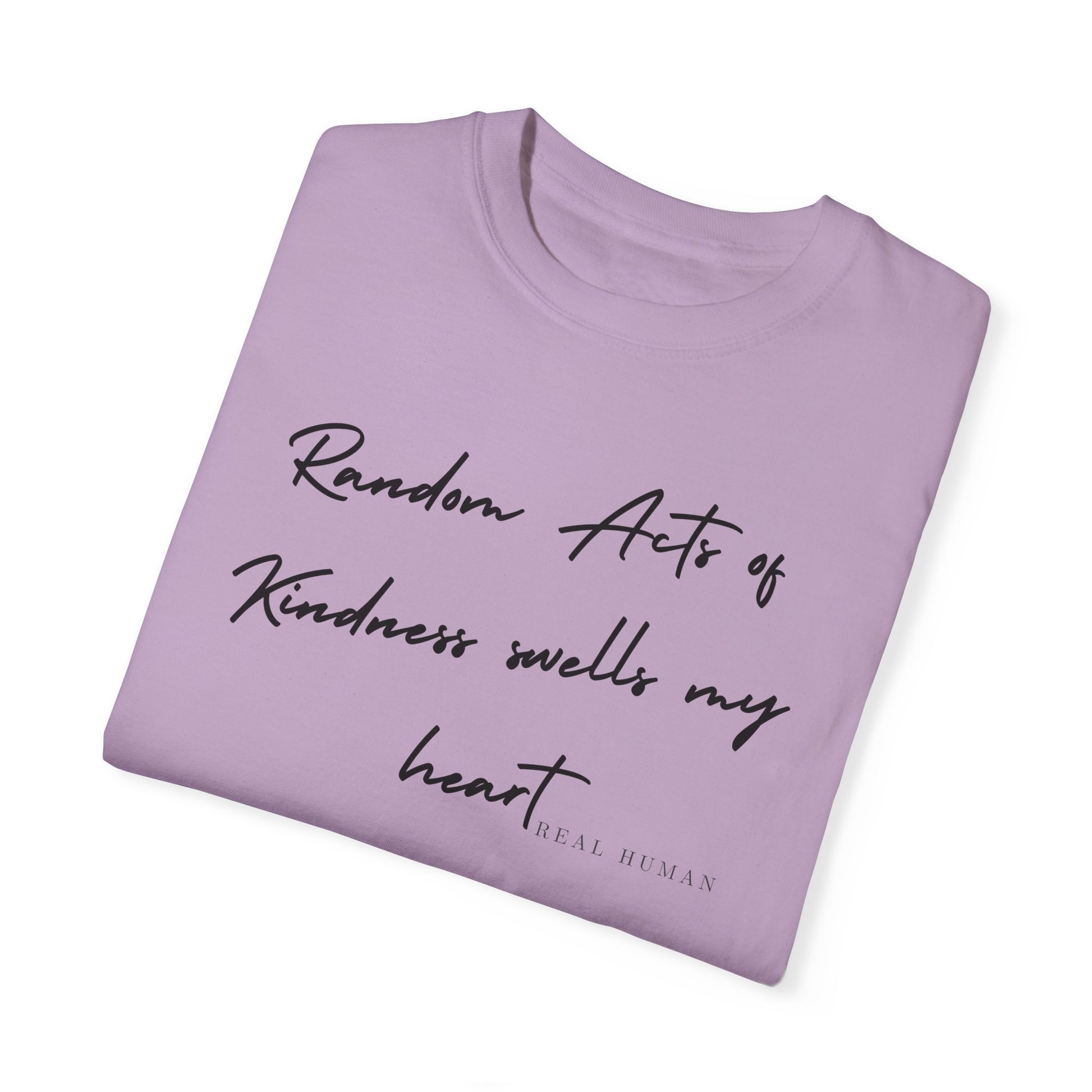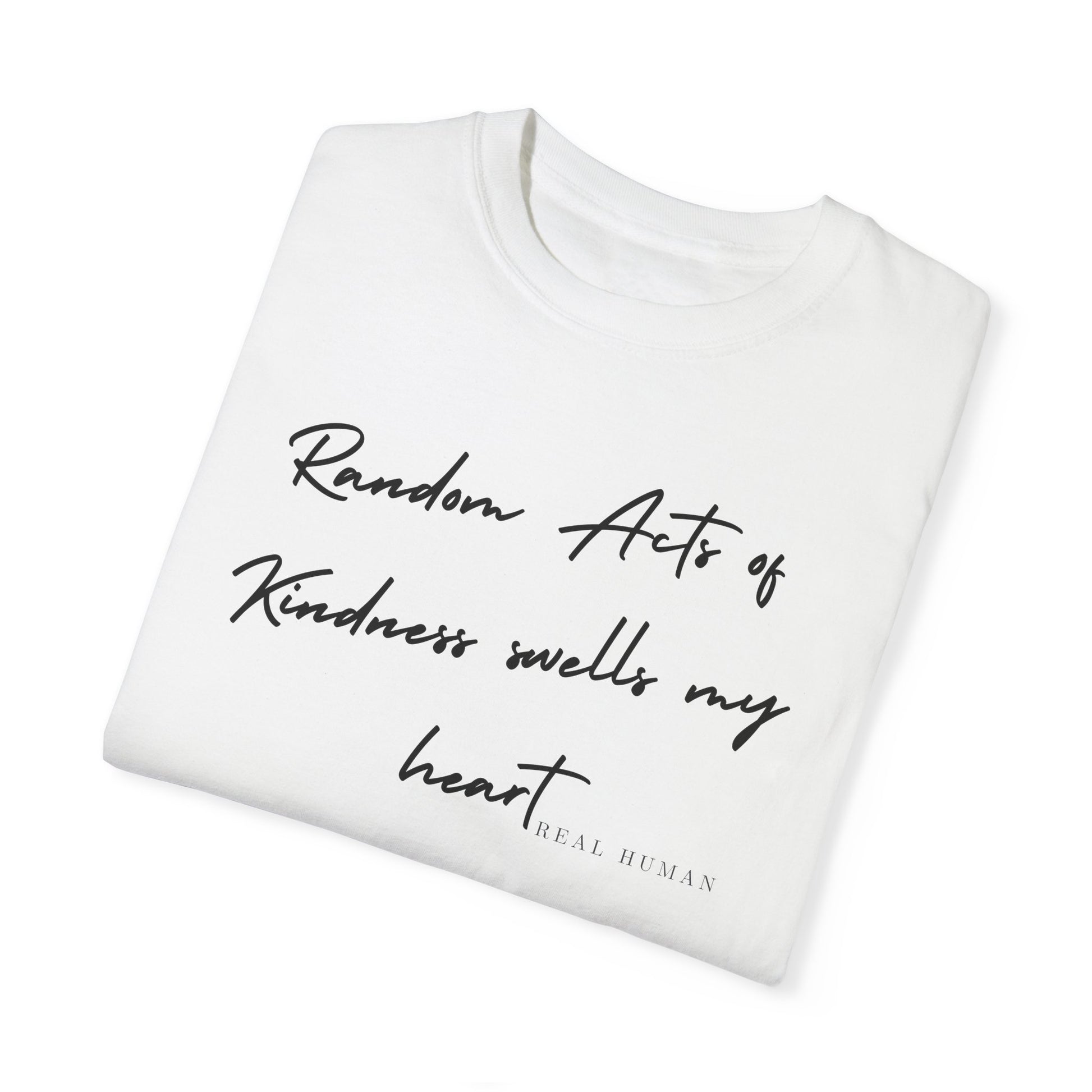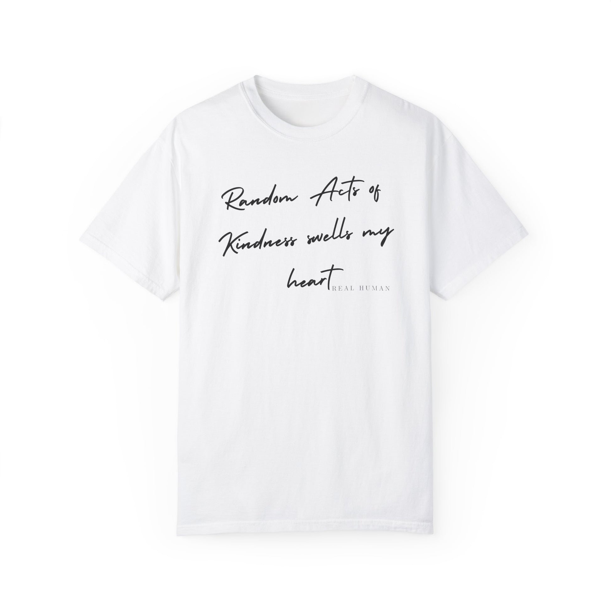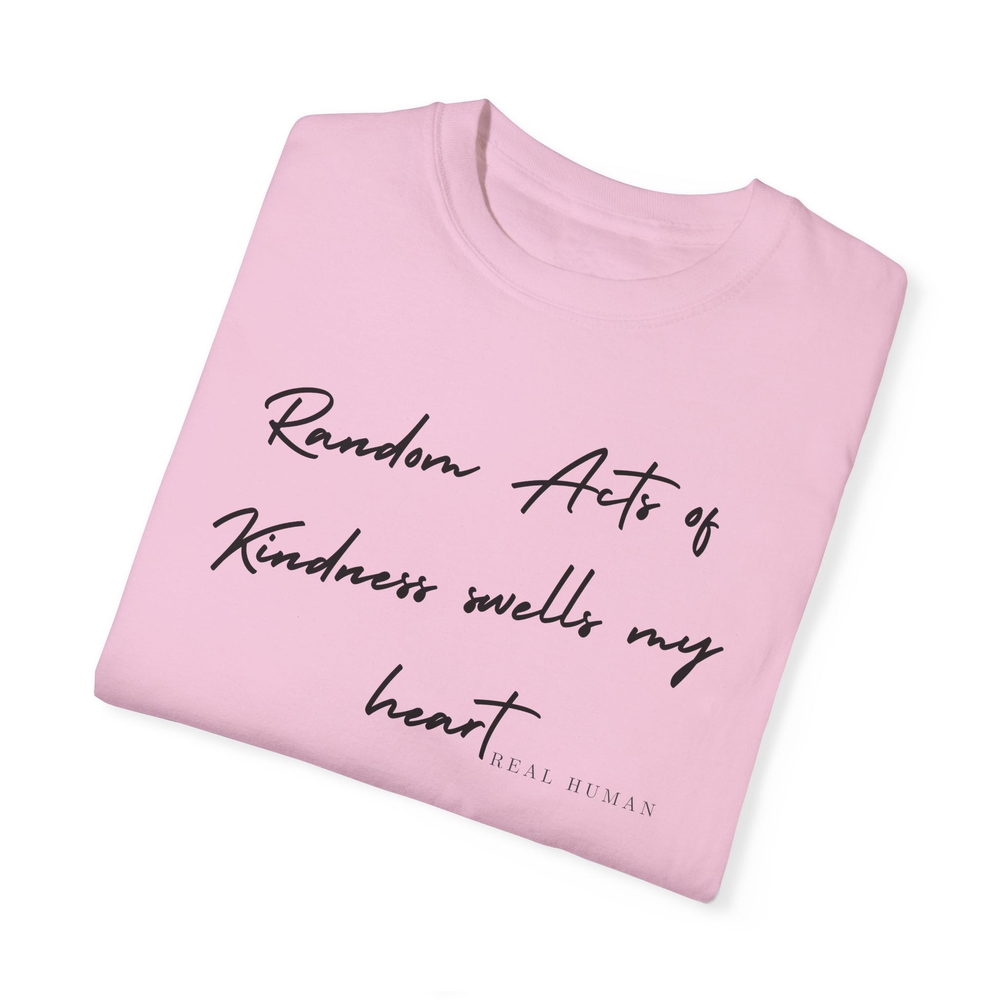 Imagine wearing something that not only looks great but also spreads a beautiful message. Our 'Real Human' collection features the heartfelt text "Random Acts of Kindness Swell My Heart" across the front of each piece. It’s a simple yet powerful reminder of the love, innocence, and kindness we all carry inside.